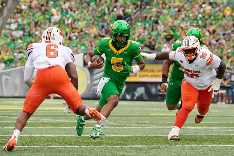 In many ways, Moore is outplaying the standard set by Gabriel in his one year as Oregon’s starter. Moore has one interception in 134 attempts. He’s averaging 8.9 yards per attempt against Power Four teams. He’s been a valuable runner, gaining 122 yards on 5.1 yards per carry, and used his legs to extend several key gains against Penn State. Moore’s success has been a testament to his talent and Oregon’s forward-thinking succession plan heading into last season.