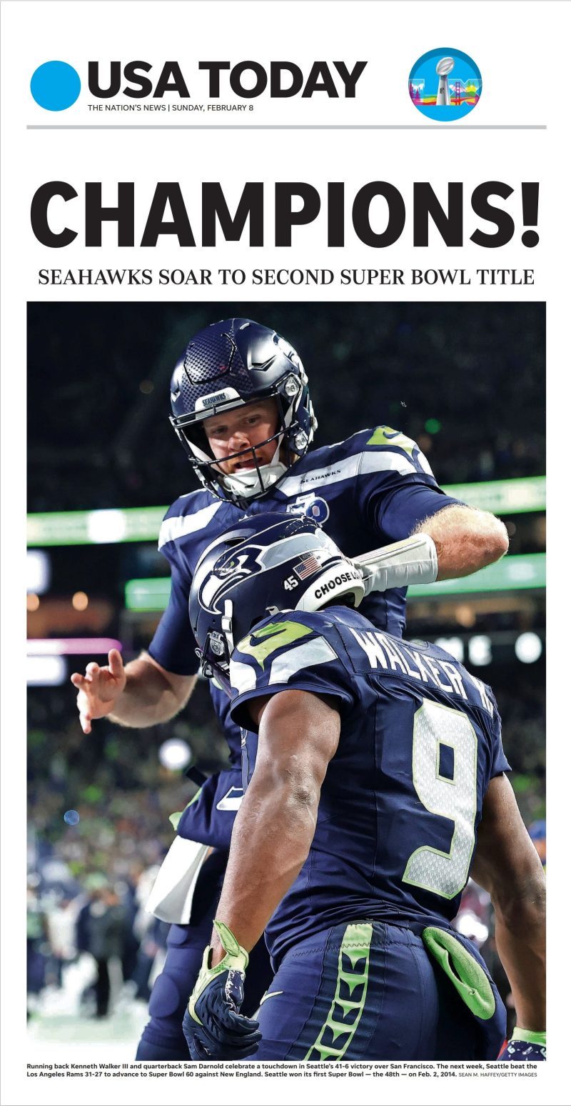 “CHAMPIONS!” is a true collector’s item. This page print served as the front and back covers of a four-page newspaper printed for limited distribution at Super Bowl 60 at Levi’s Stadium in Santa Clara, California. Did you catch it on TV? In the winning team’s locker room? On social media?